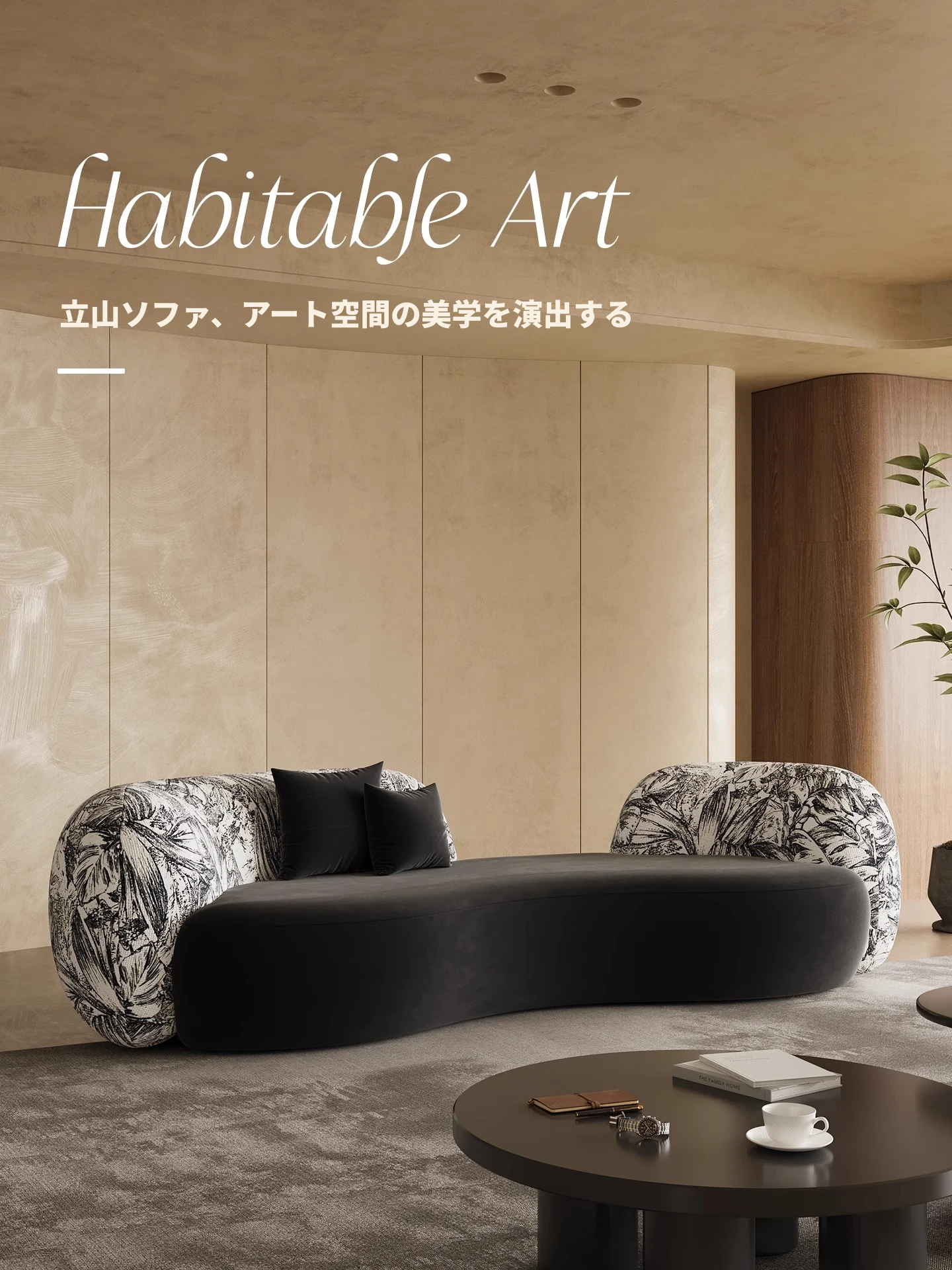 科莫歌デザインのプルームソファ - インスタ映えする異形イタリアンアーチ型ファブリックシェルソファ!おしゃれで快適、リビングを華やかに彩る一品。お友達との集まりにもぴったり!