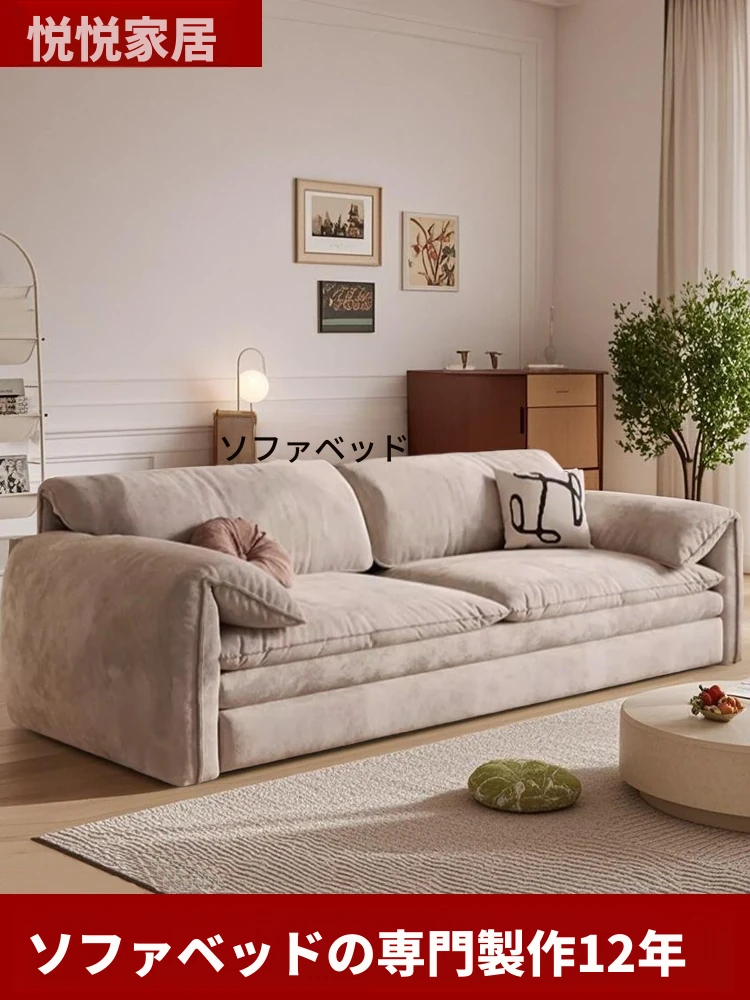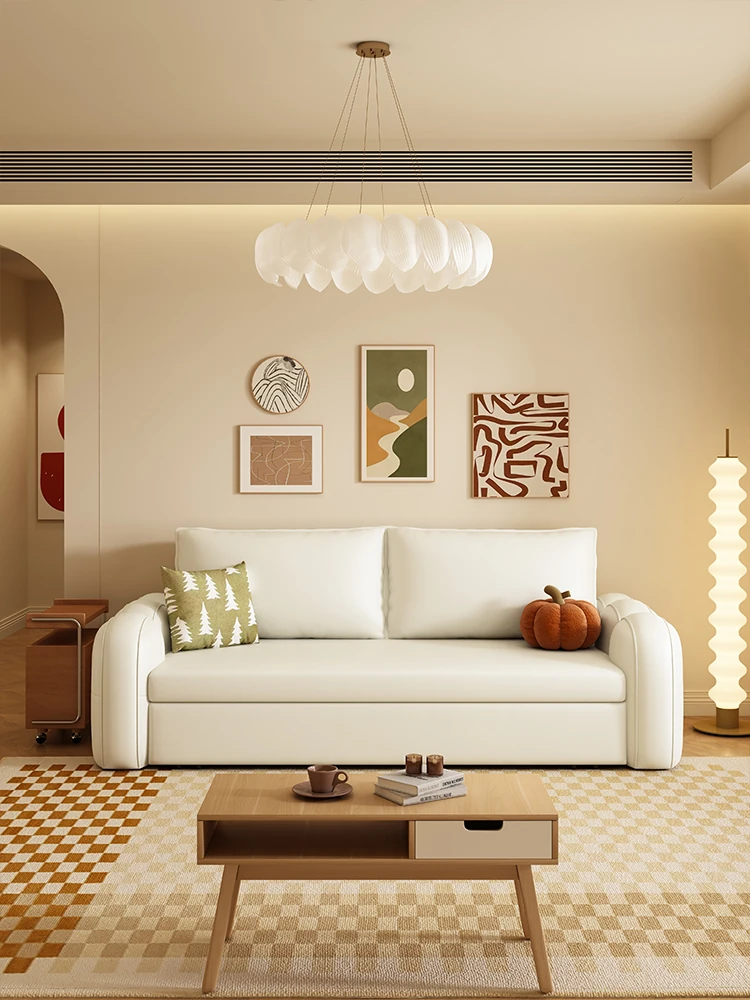 クリーム色のヴィンテージ風2025新作ソファベッド、マシュマロのような心地よさ!小型リビングにぴったりな折りたたみ2WAYデザイン、ナパレザー使用で高級感もバッチリ!