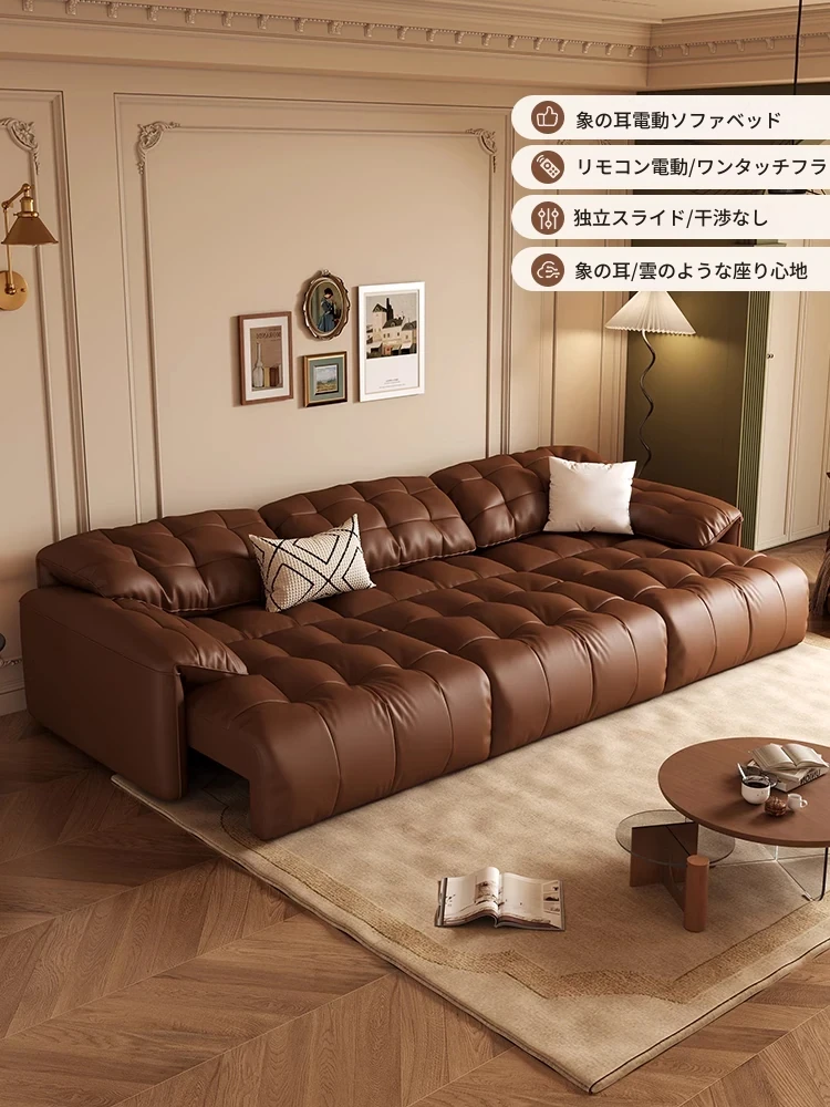 エレファントイヤー電動本革ソファベッド - リビングルームにぴったりなイタリアンヴィンテージスタイル、伸縮機能付きで小型・大型どちらのお部屋にも対応!おしゃれで快適な空間を演出します。