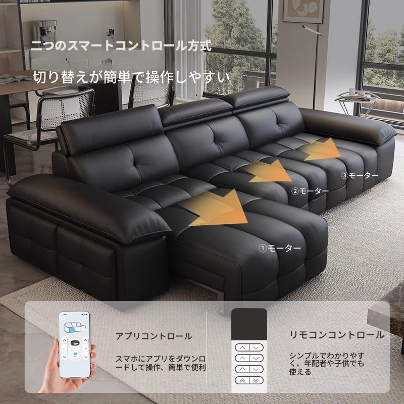 電動機能付き本革ソファ|リビングに最適な上質な牛革使用|壁にぴったり設置可能|サイズ調整可能なプレミアムファーストクラスソファで快適なひとときを!