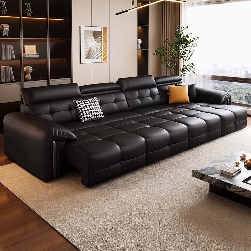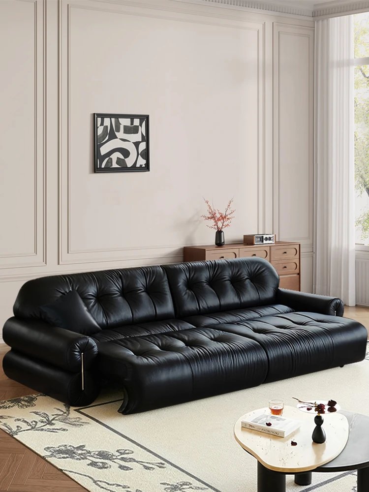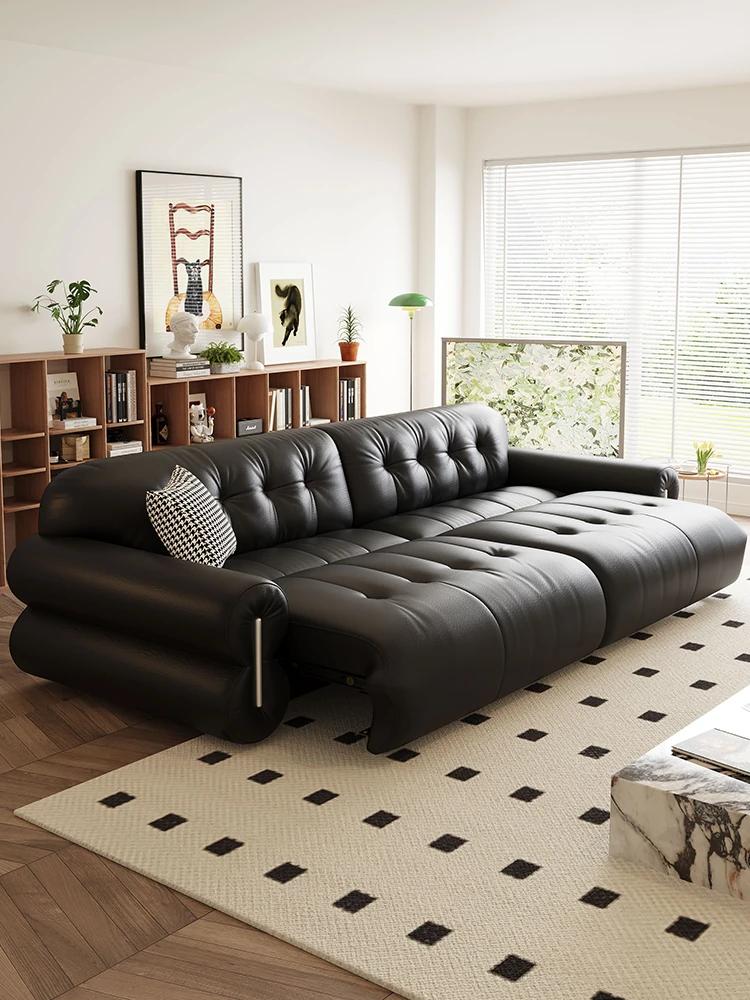 レトロな黒糖雲のソファベッド、イタリアンミニマリズムのリビングにぴったり!中古風のブラック電動機能付き本革ソファで、スタイリッシュさと快適さを両立。あなたの空間を格上げする一品です!