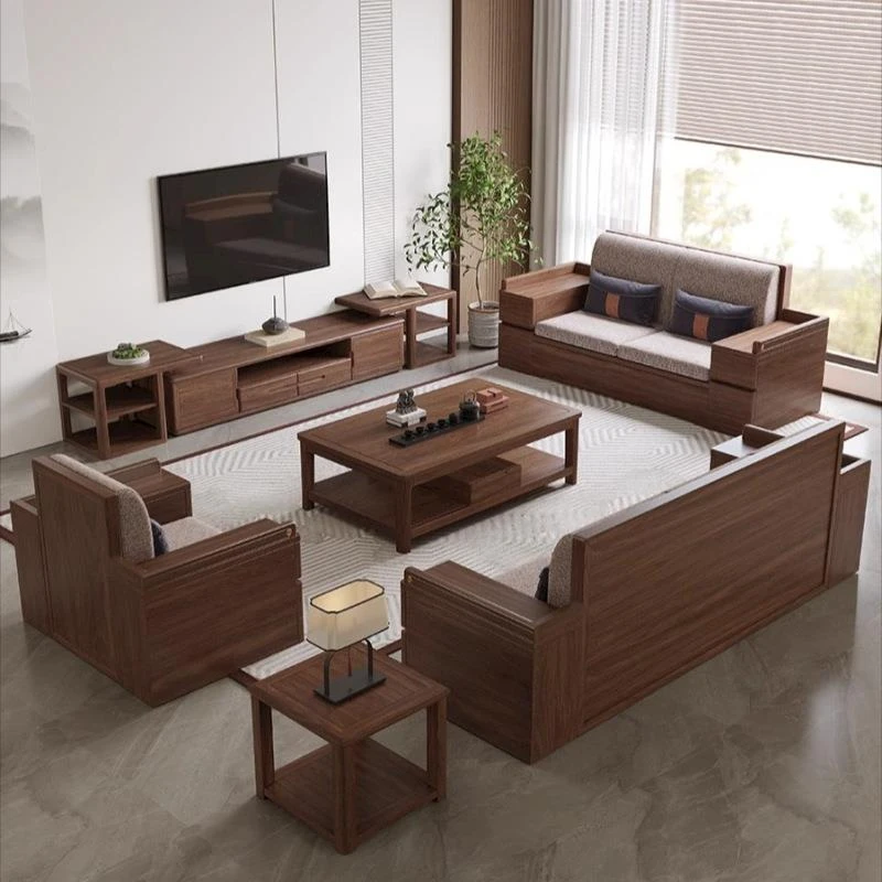 Versatile All-Season Solid Black Walnut Sofa Set with Storage for Small Spaces – Elegant Chinese Style Solid Wood Living Room Furniture