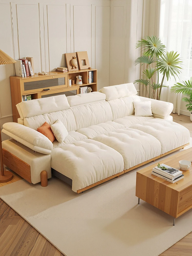 Japanese-style Wooden Cream Color Multifunctional Sofa Bed for Small Living Rooms – 2025 New Model, Versatile Storage Solution & Cozy Design