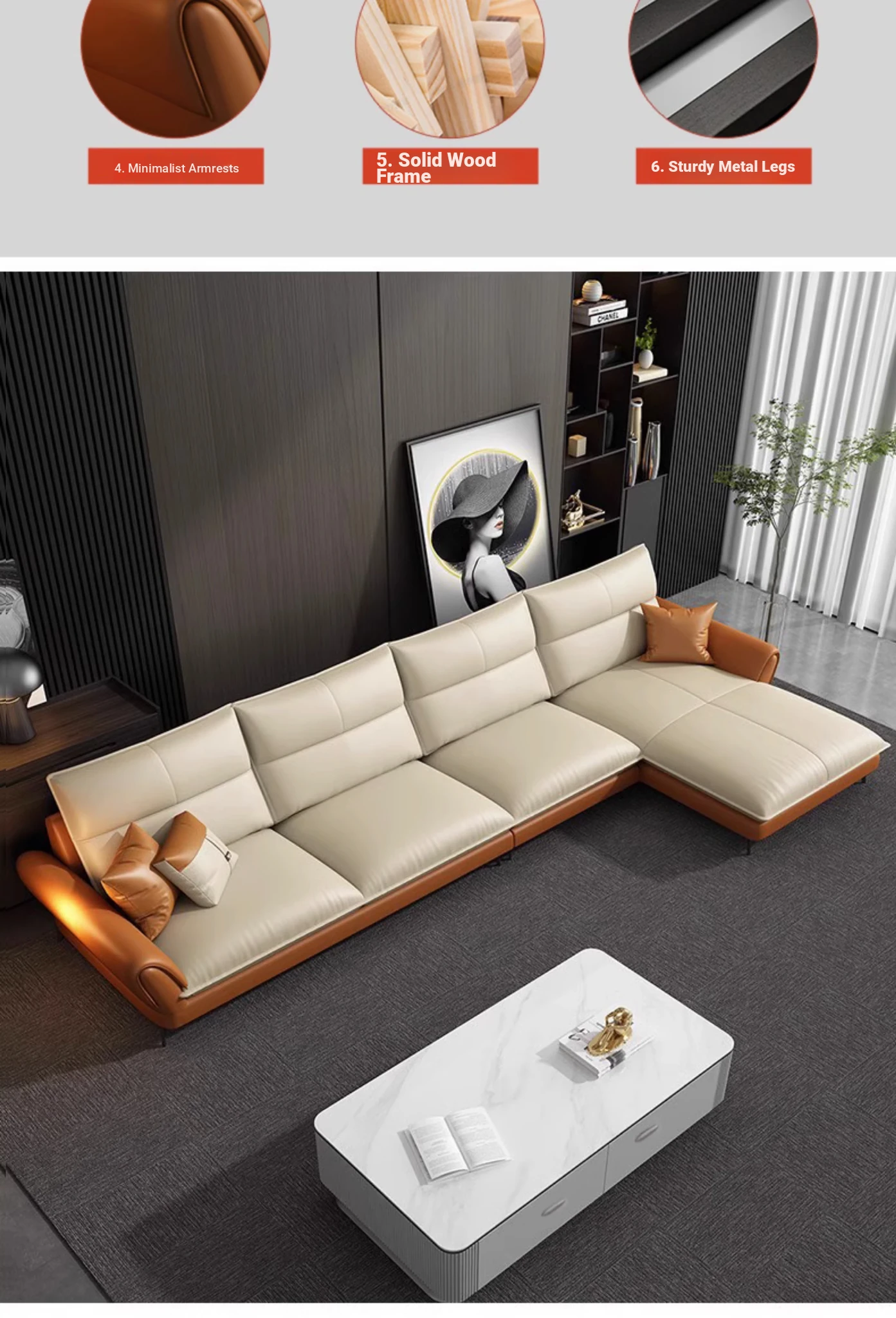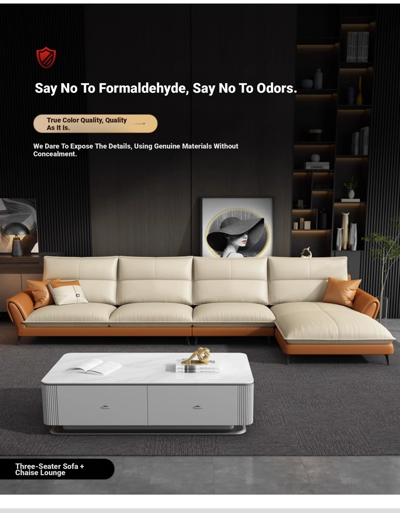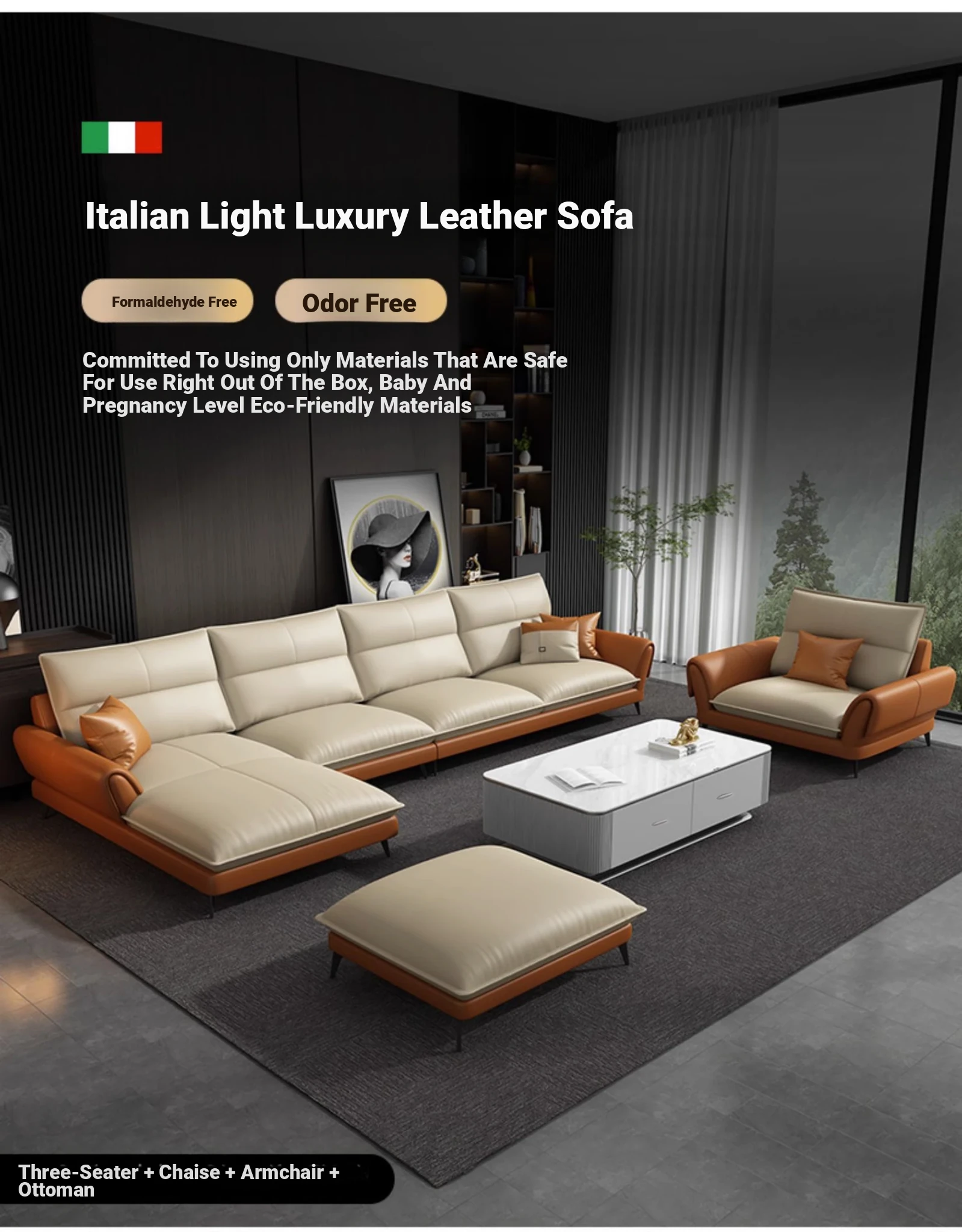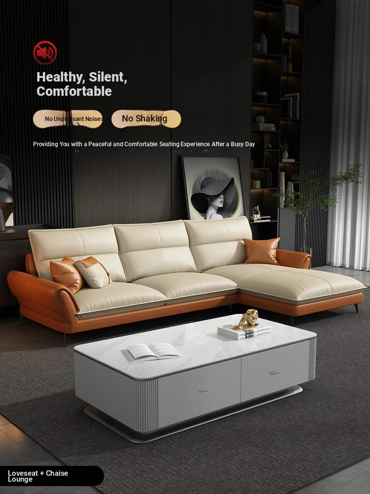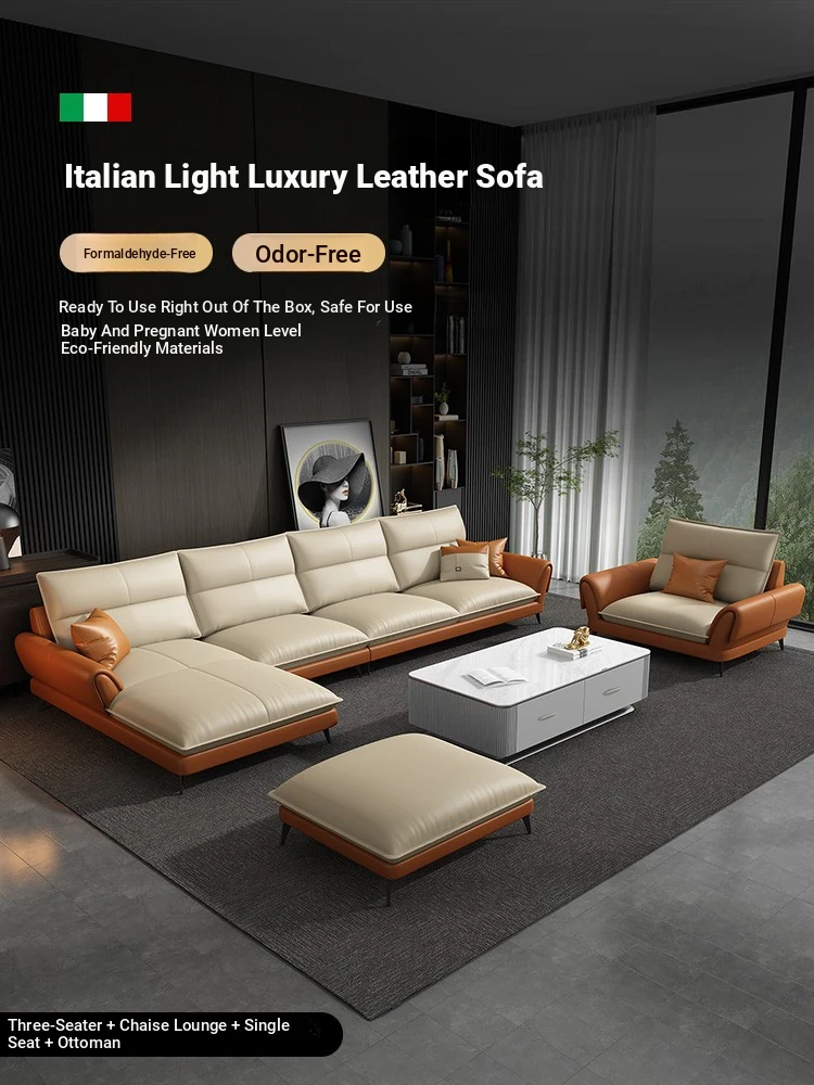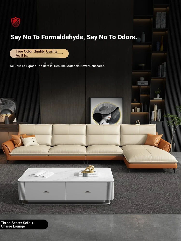 Genuine Leather Sofa - Modern Minimalist Design for Small Spaces, Nordic Style, 3-4 Seater Chaise Lounge Combination for Your Living Room