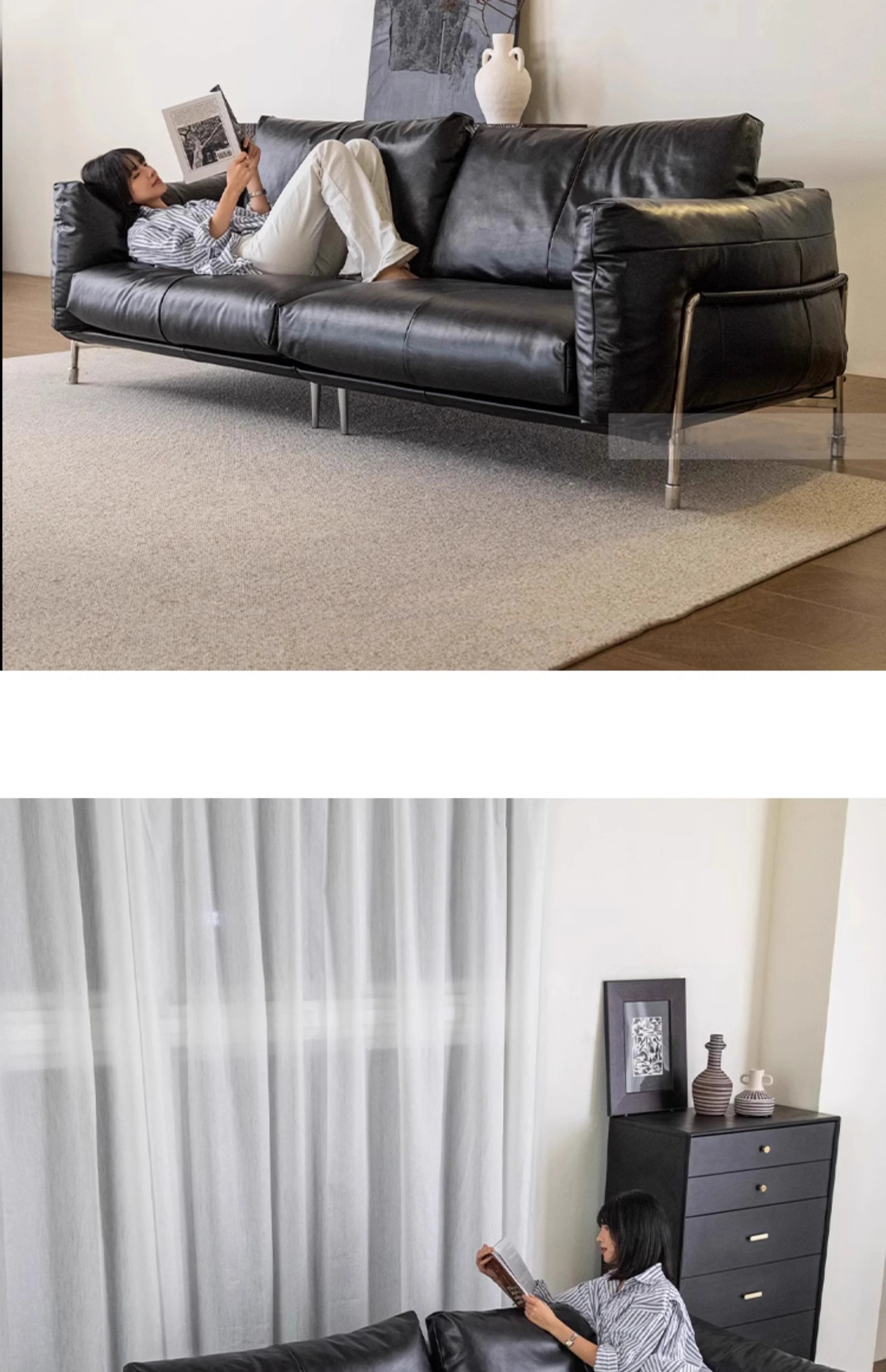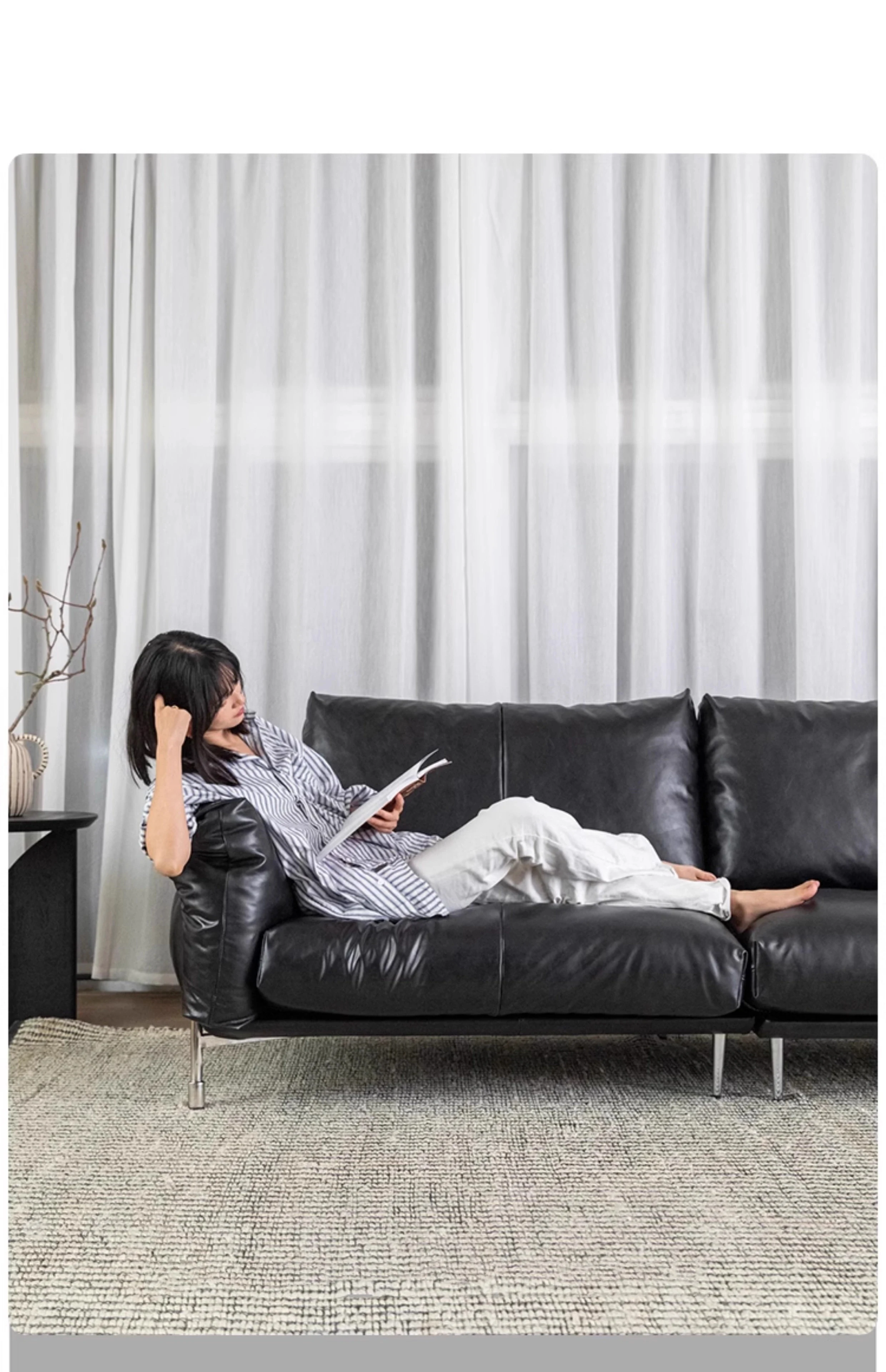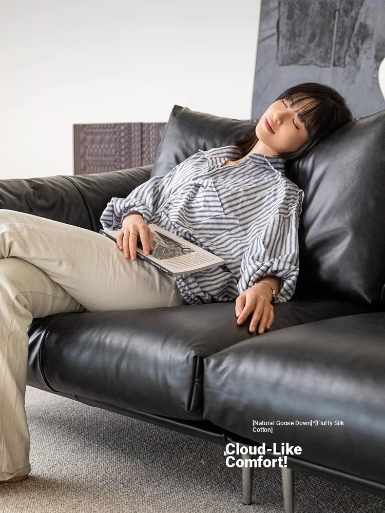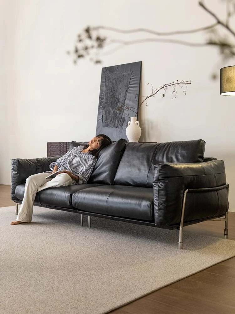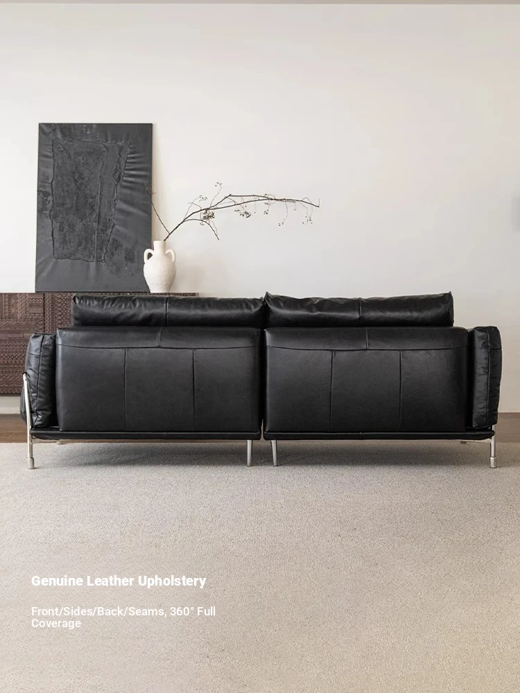 Minimalist Bauhaus-Inspired Dark Knight Sofa - Black Genuine Leather Designer Sofa for Small Spaces, Perfect for Modern Living Rooms, 3-Seater Elegance.