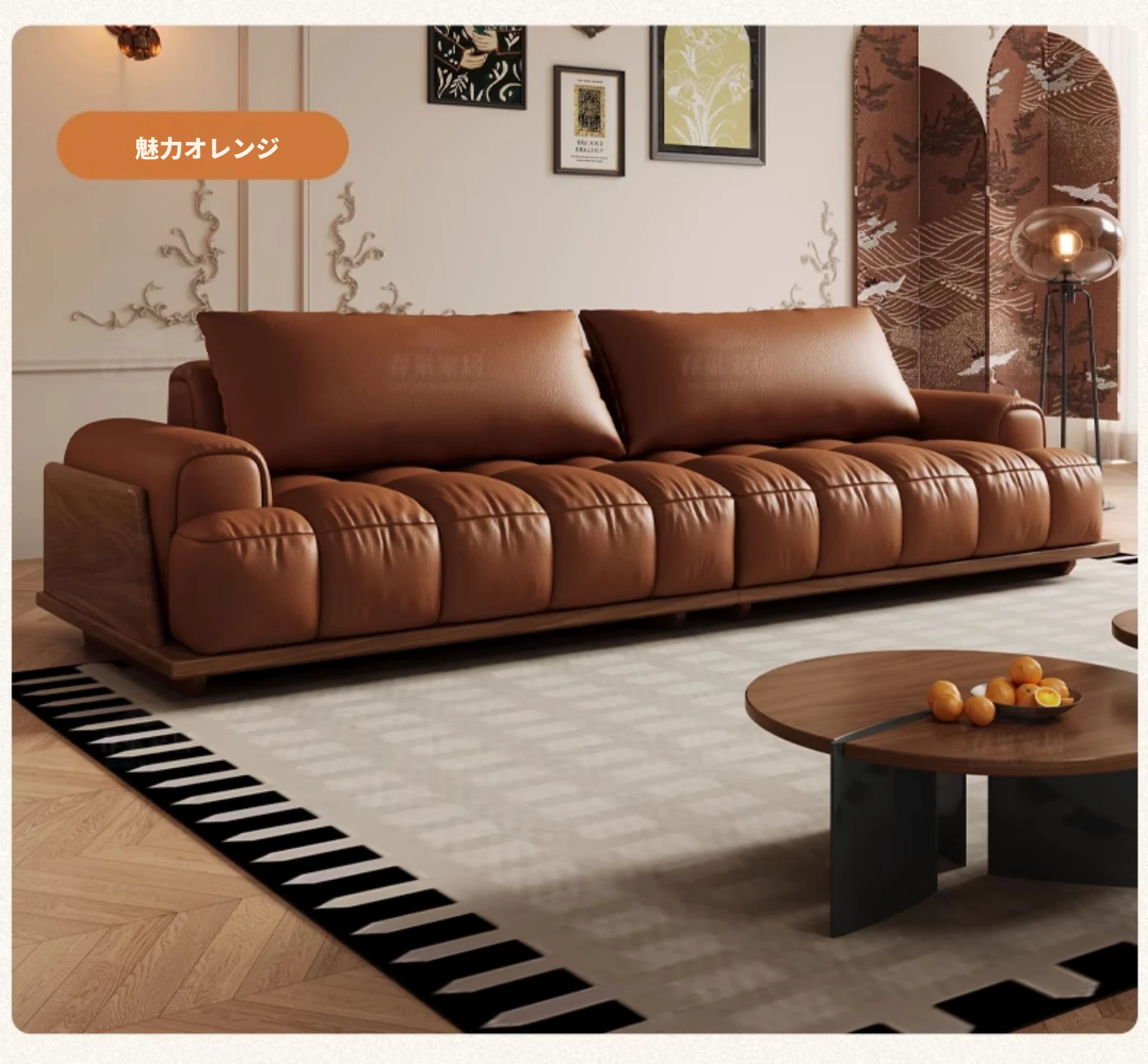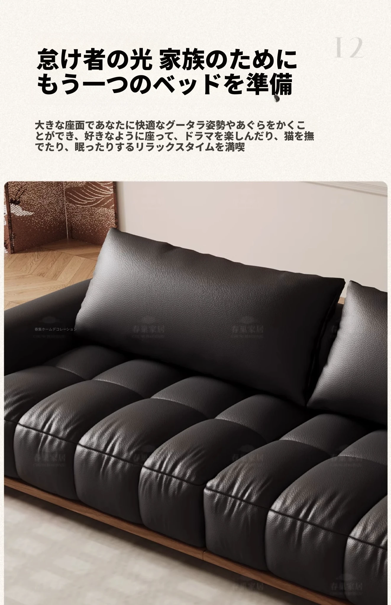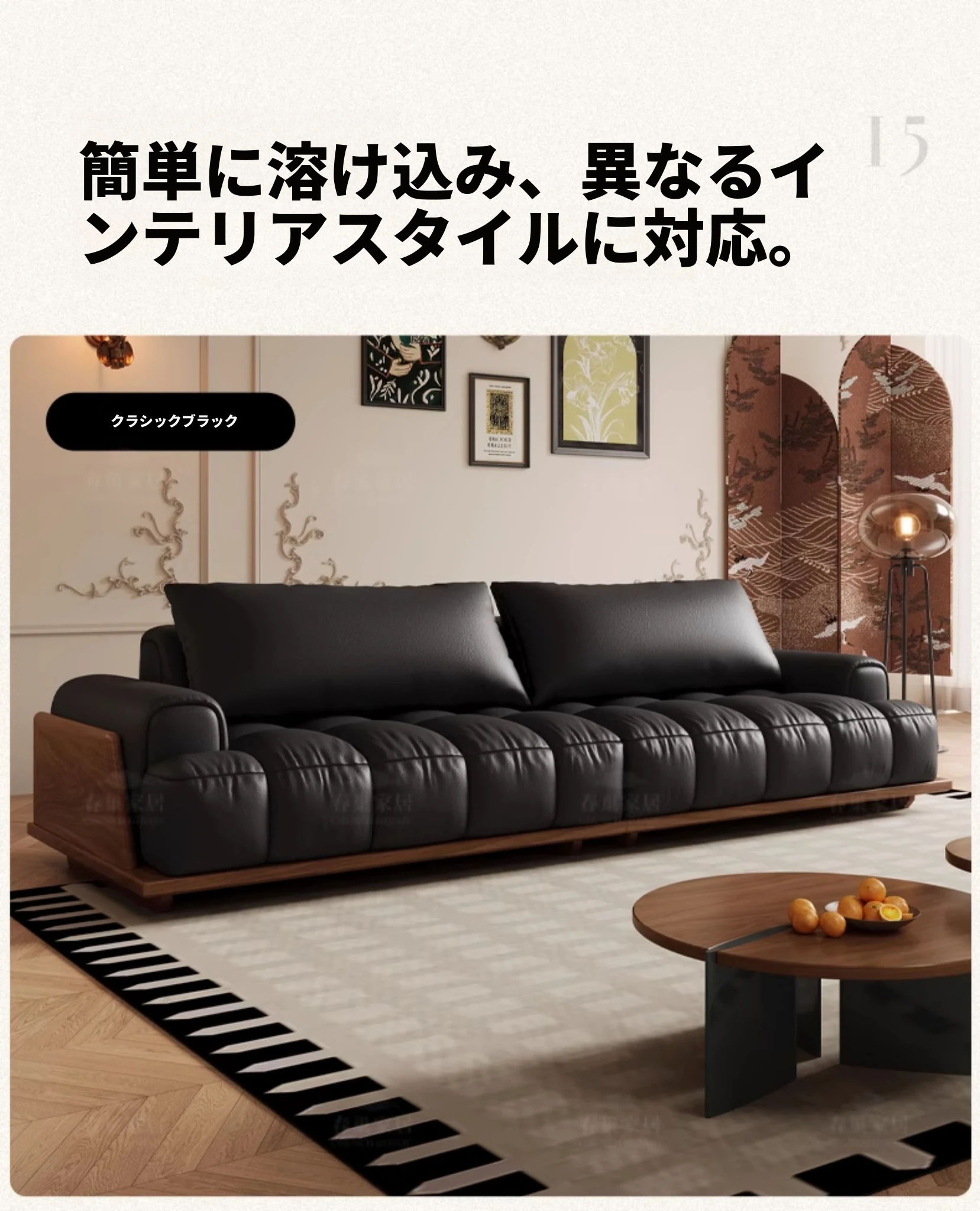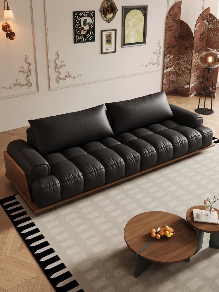 2025年新作!フレンチヴィンテージスタイルのブラックウォールナット製ソファ - 小型リビングにぴったりな4人掛け、直線デザインの本革ポフ。上質な素材と洗練されたデザインで、居心地の良い空間を演出します!