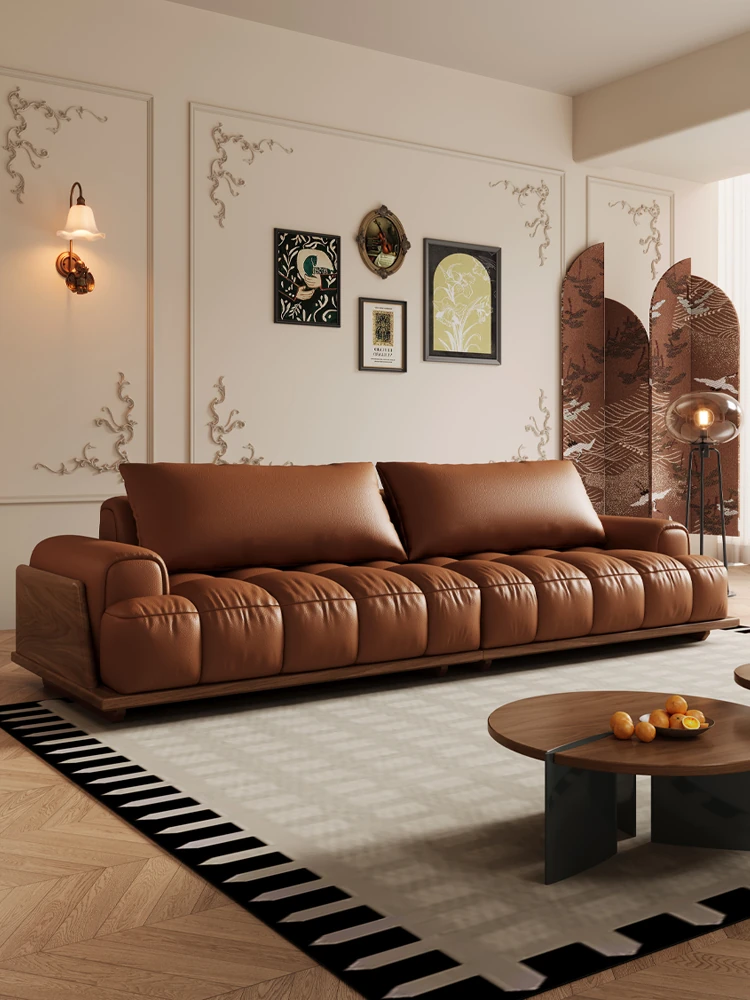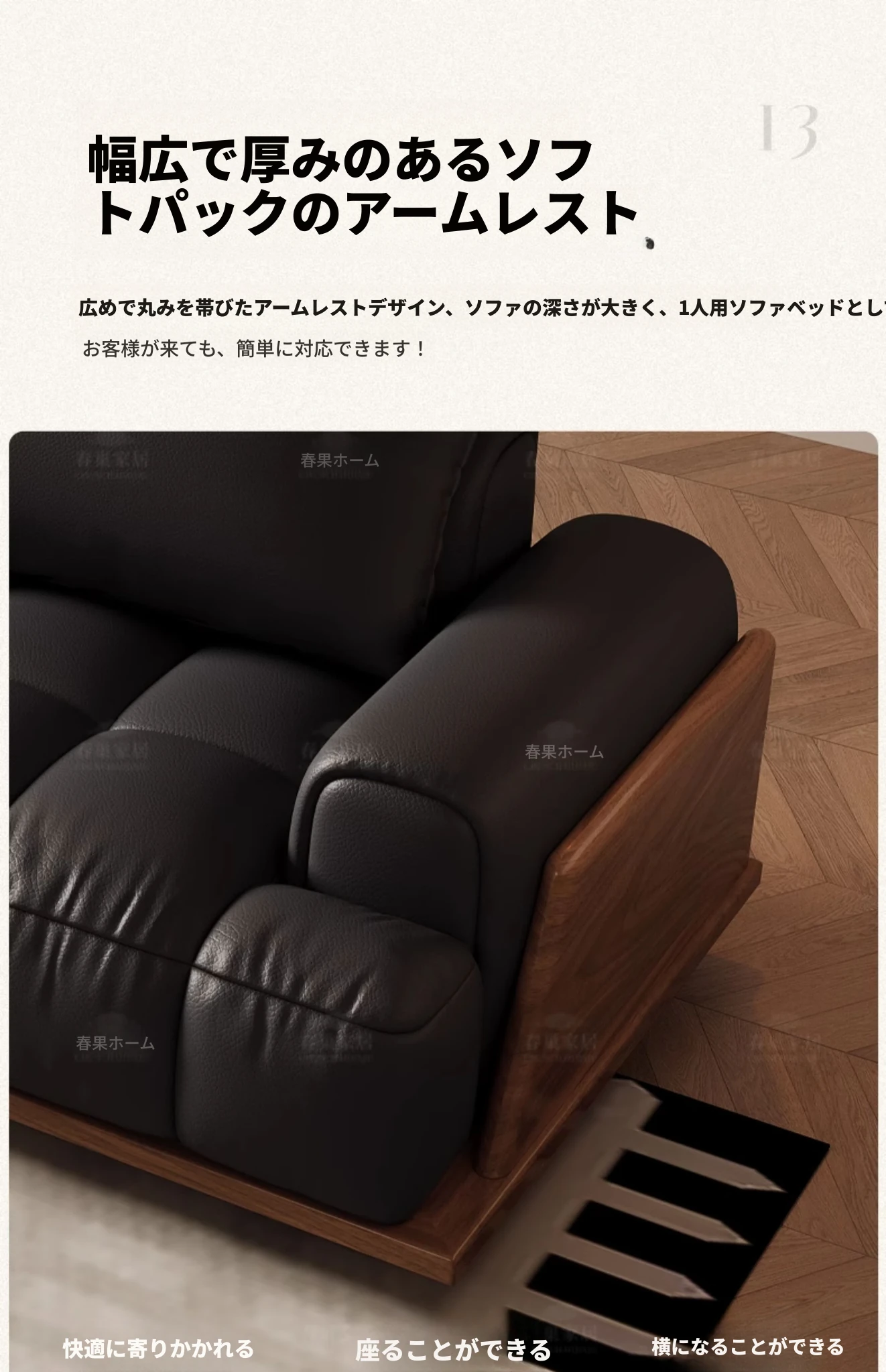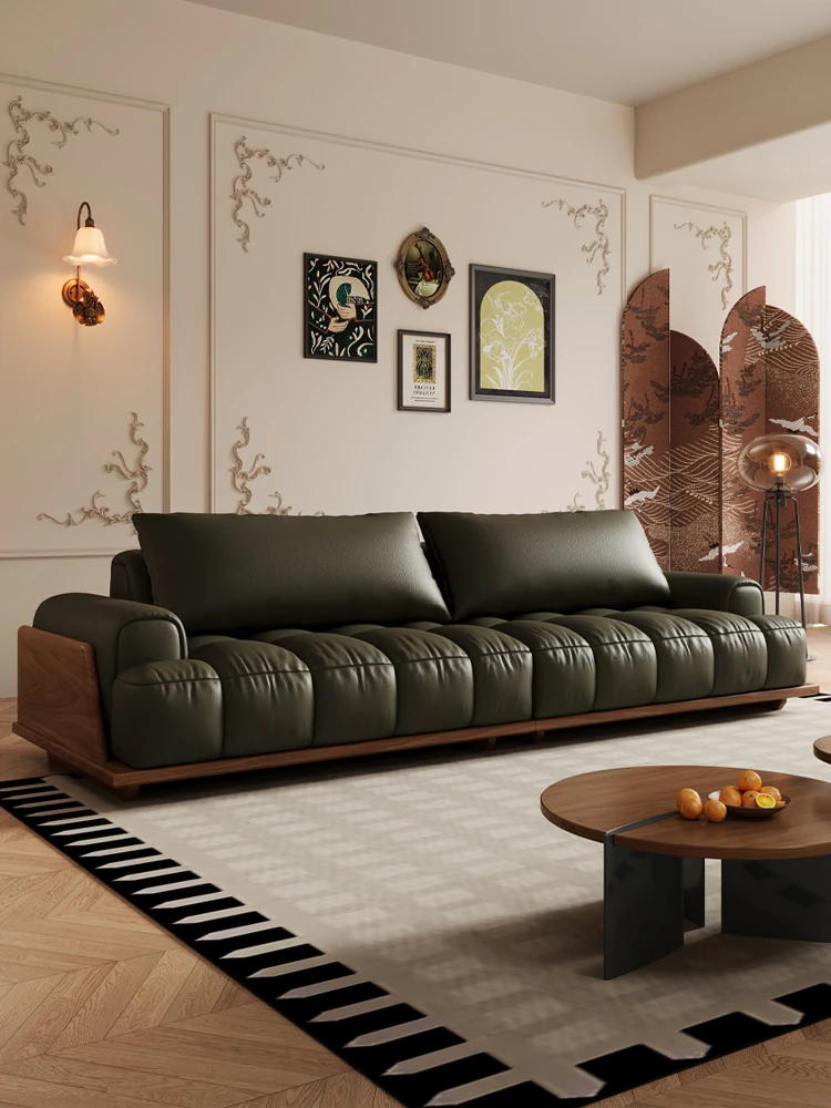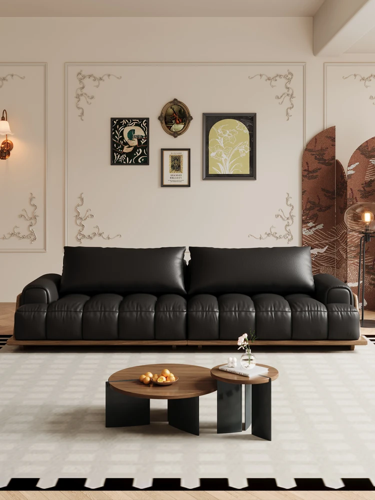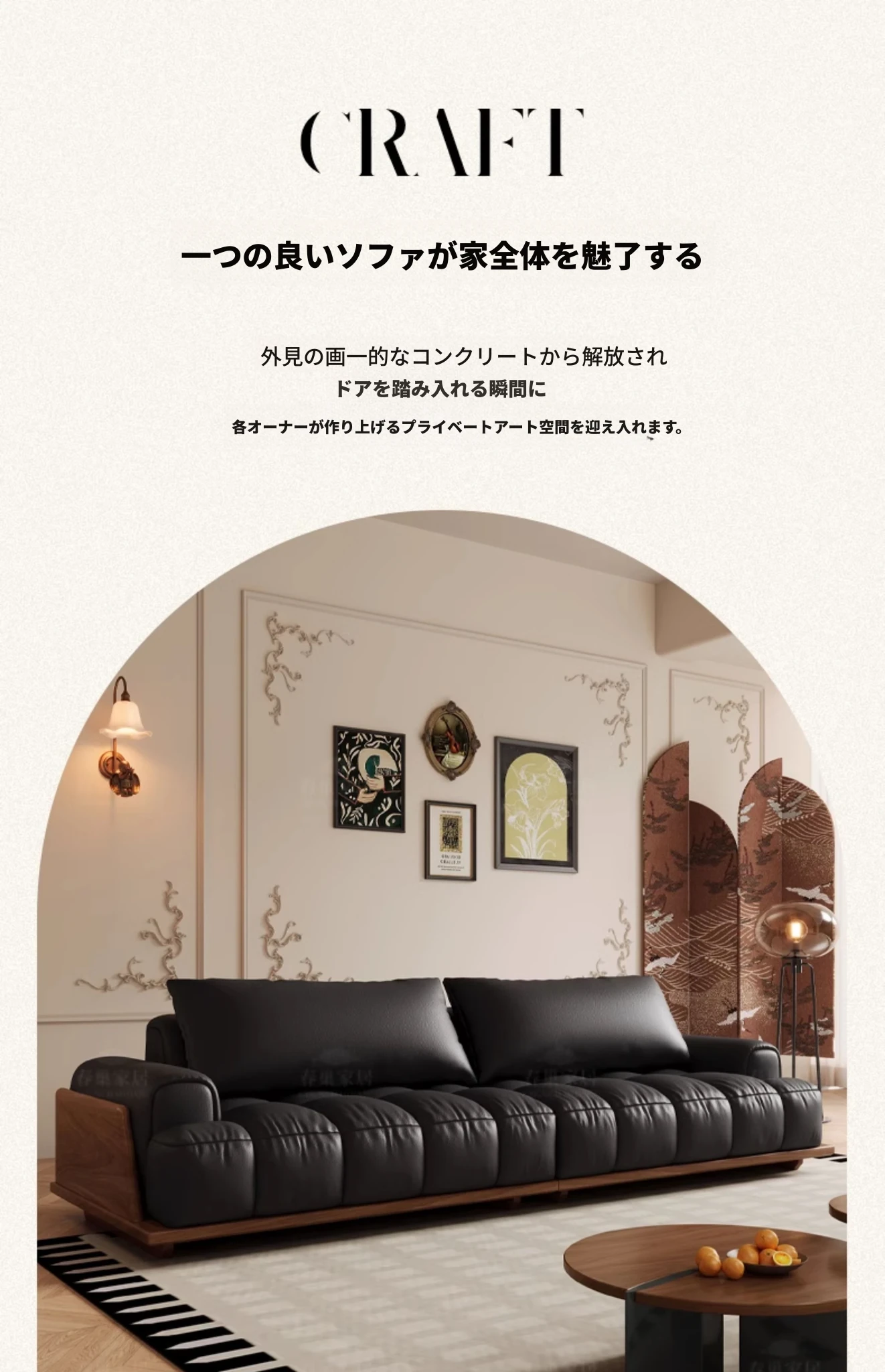 2025年新作!フレンチヴィンテージスタイルのブラックウォールナット製ソファ - 小型リビングにぴったりな4人掛け、直線デザインの本革ポフ。上質な素材と洗練されたデザインで、居心地の良い空間を演出します!
