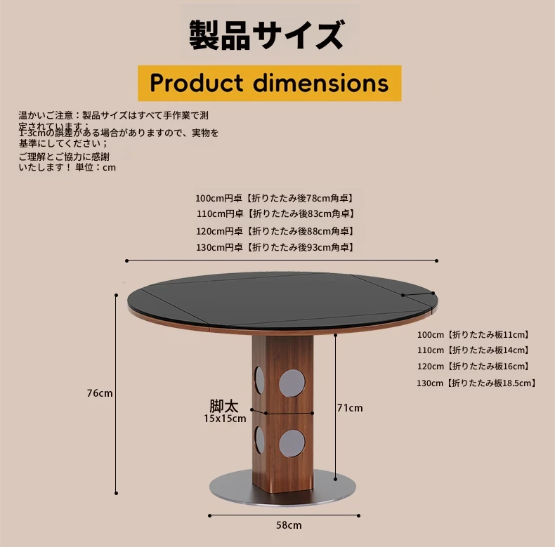 1.3メートル 墨宸黒 4つ折り円形テーブル【イノロ岩板】