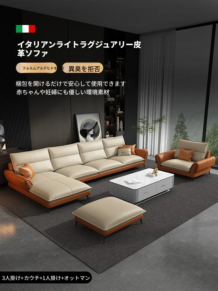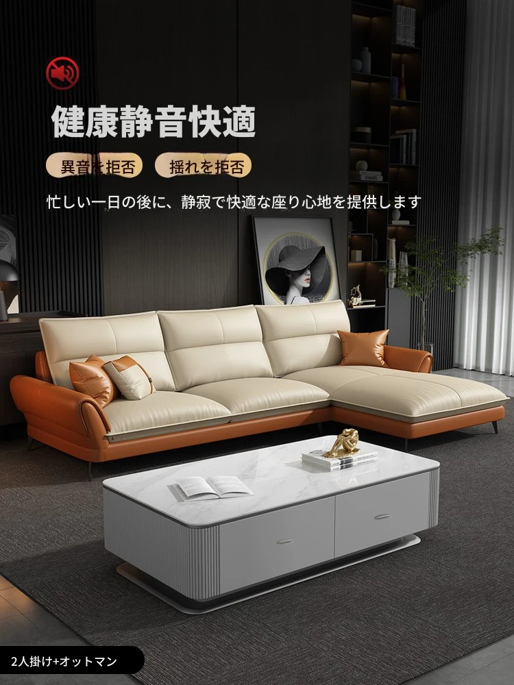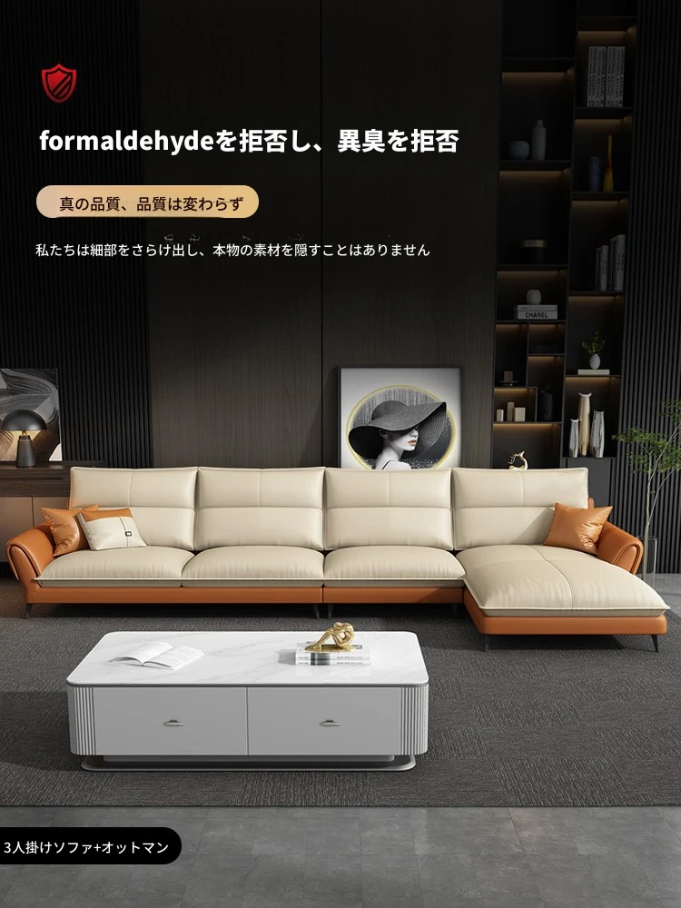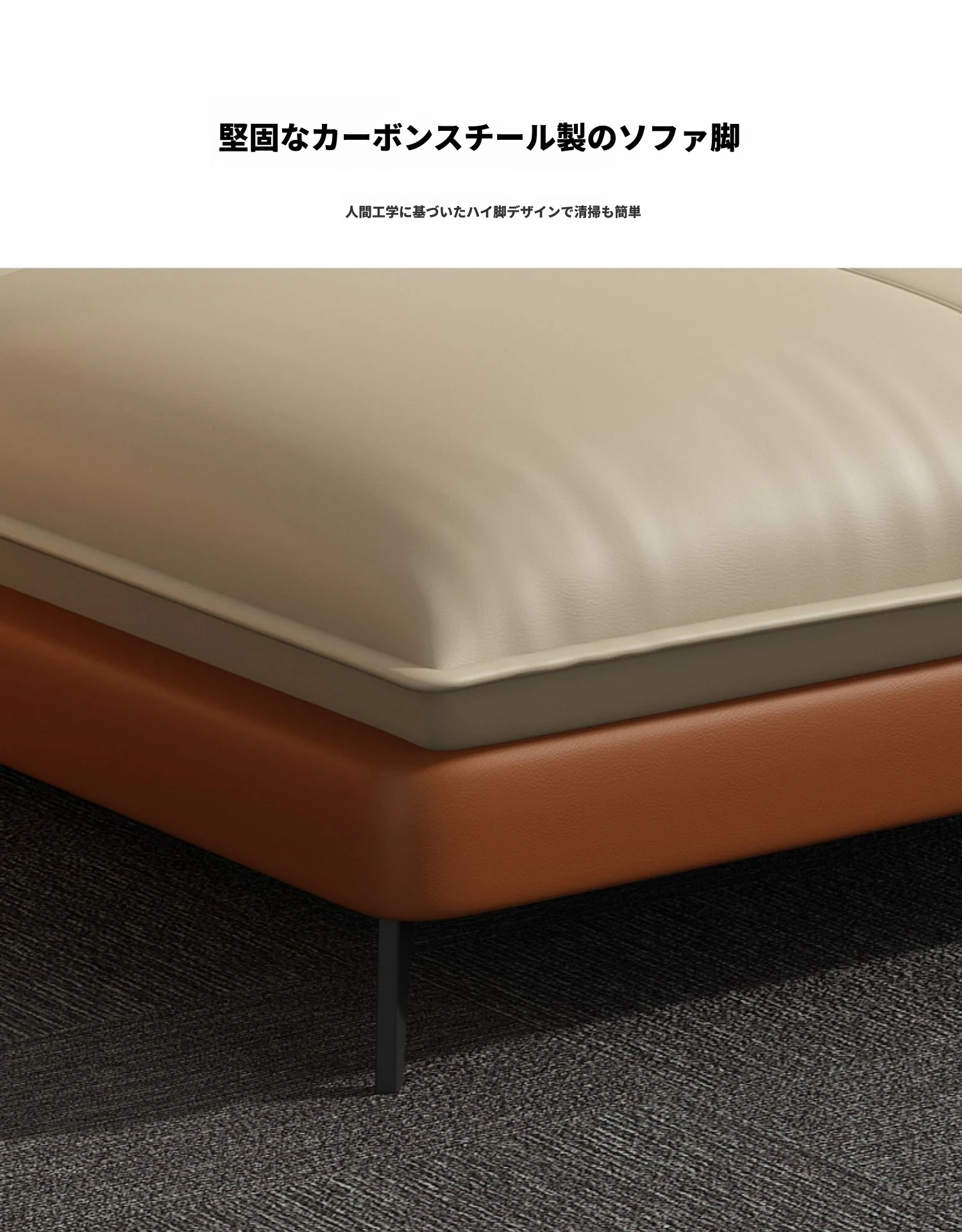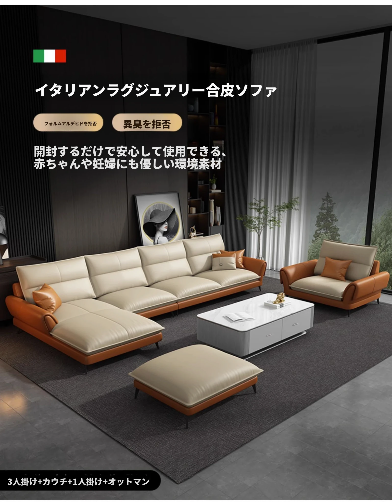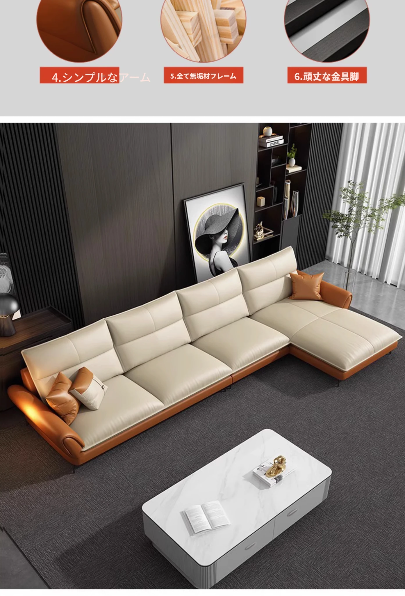 本革製のソファー - 高級な牛革使用、シンプルでモダンなデザイン。北欧スタイルのリビングに最適な三〜四人用のカウチソファー、大型コンビネーションで快適な空間を実現!