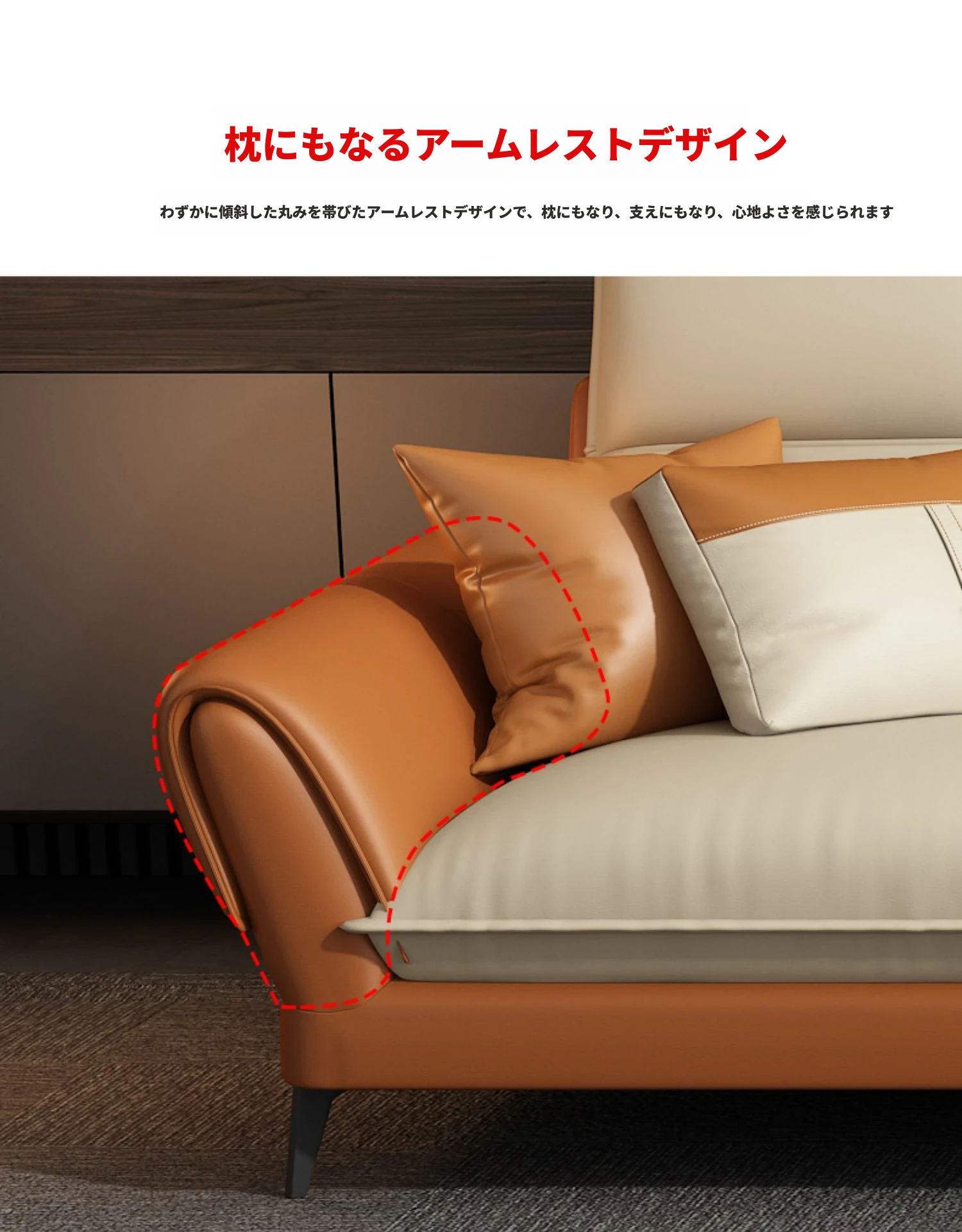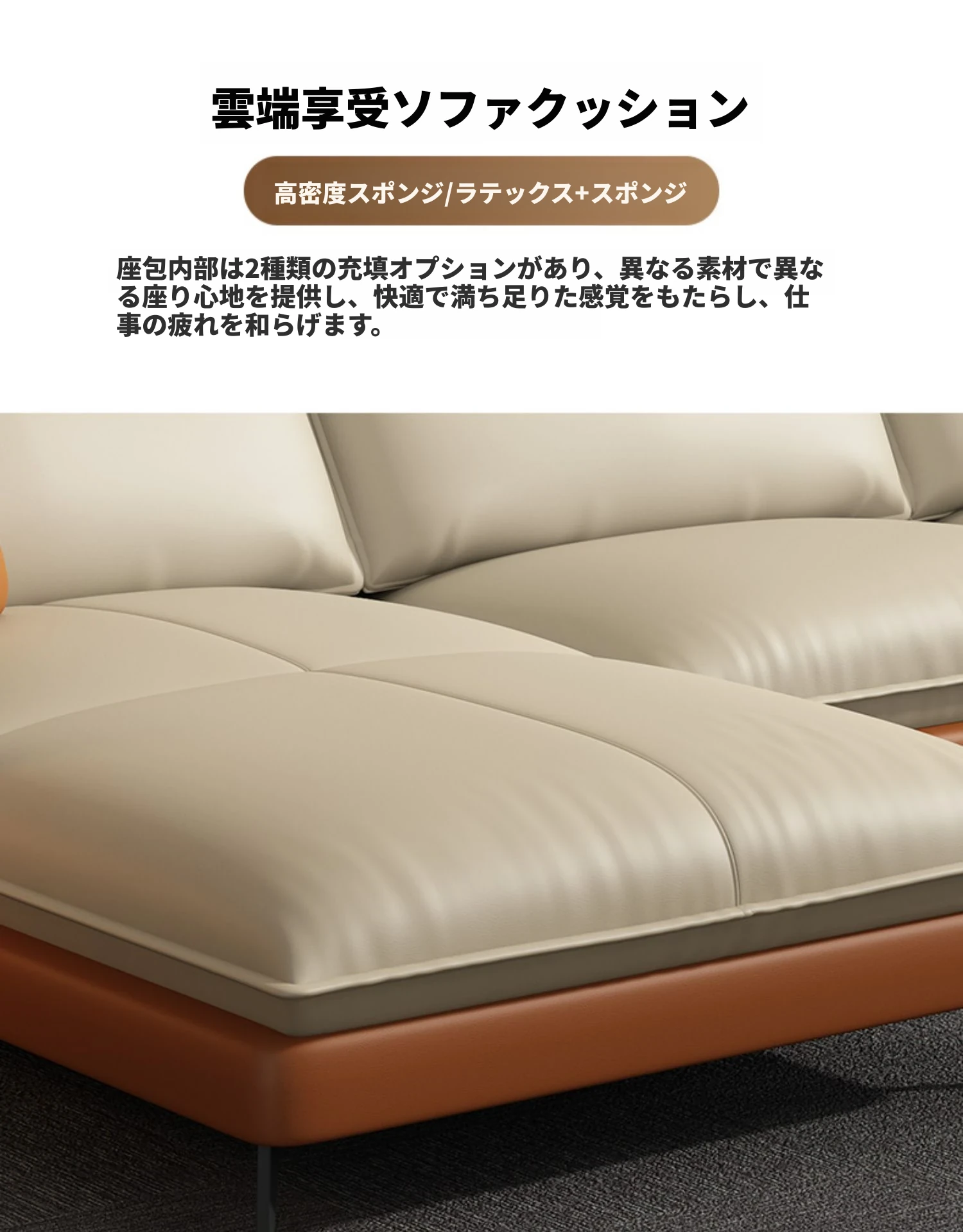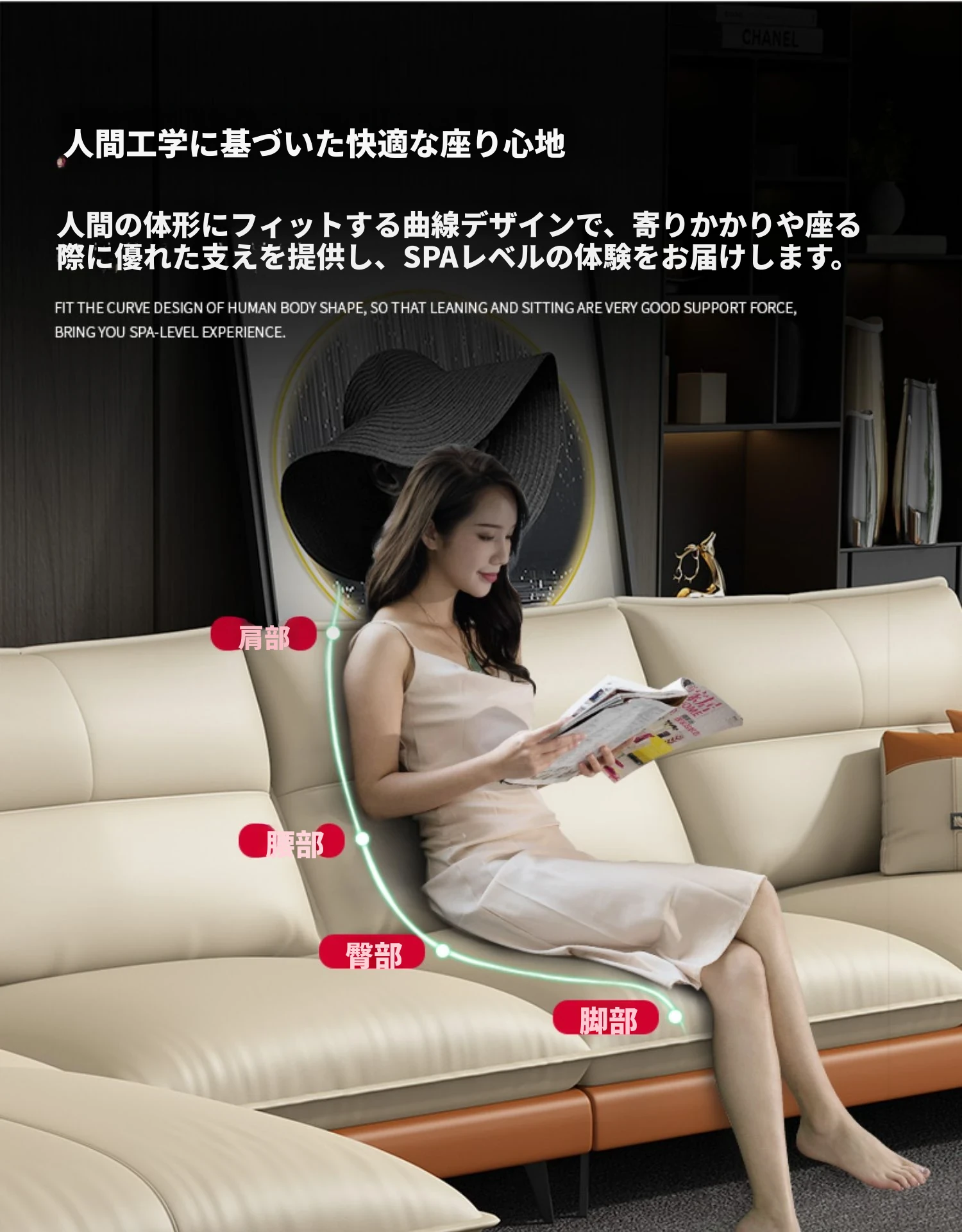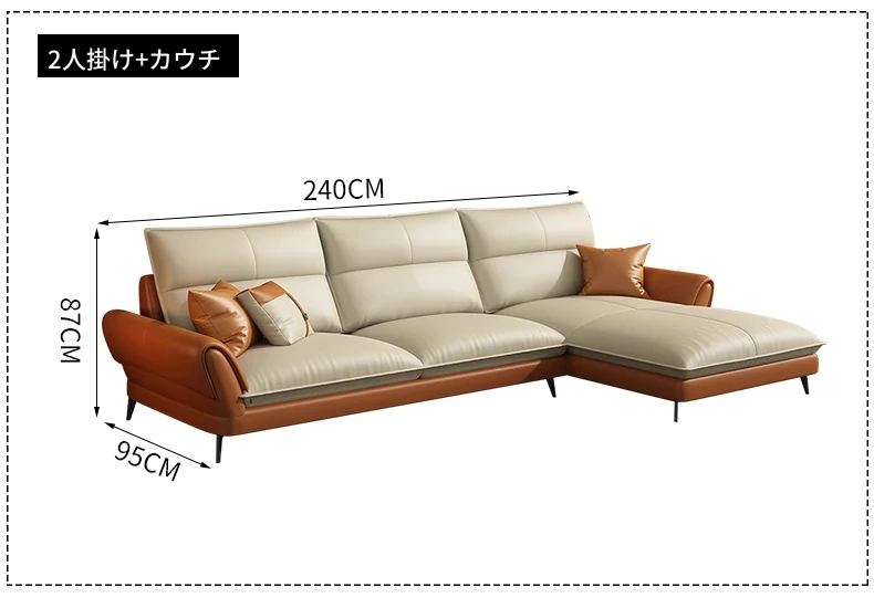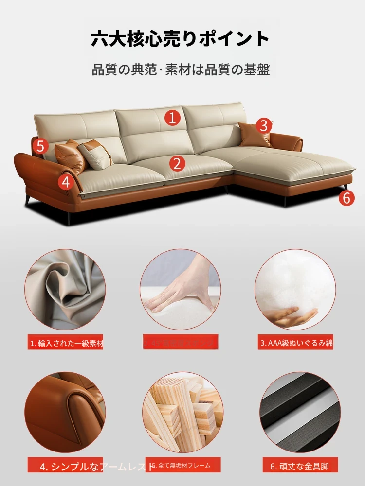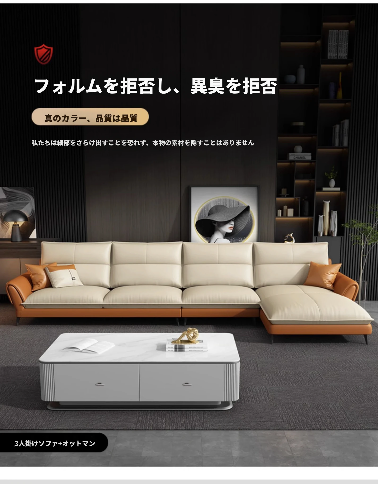 本革製のソファー - 高級な牛革使用、シンプルでモダンなデザイン。北欧スタイルのリビングに最適な三〜四人用のカウチソファー、大型コンビネーションで快適な空間を実現!