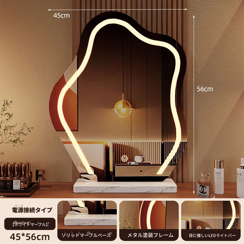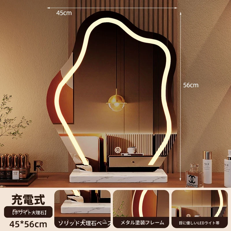 【充電・接続両用タイプ】大サイズクラウドスマートミラー45*56パールホワイト(天然大理石⭐無段階調光)