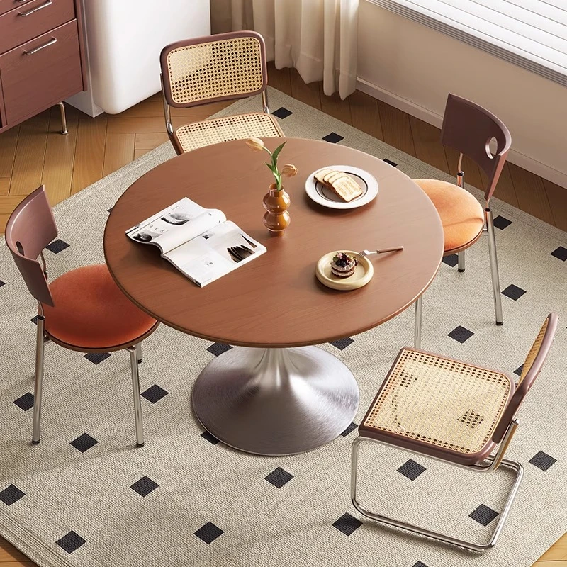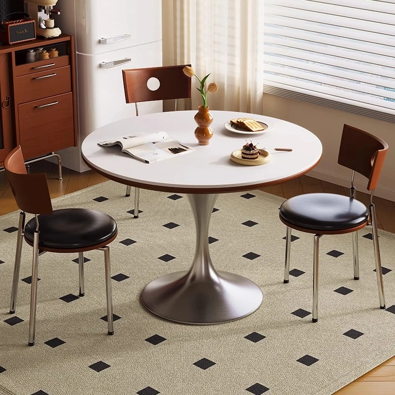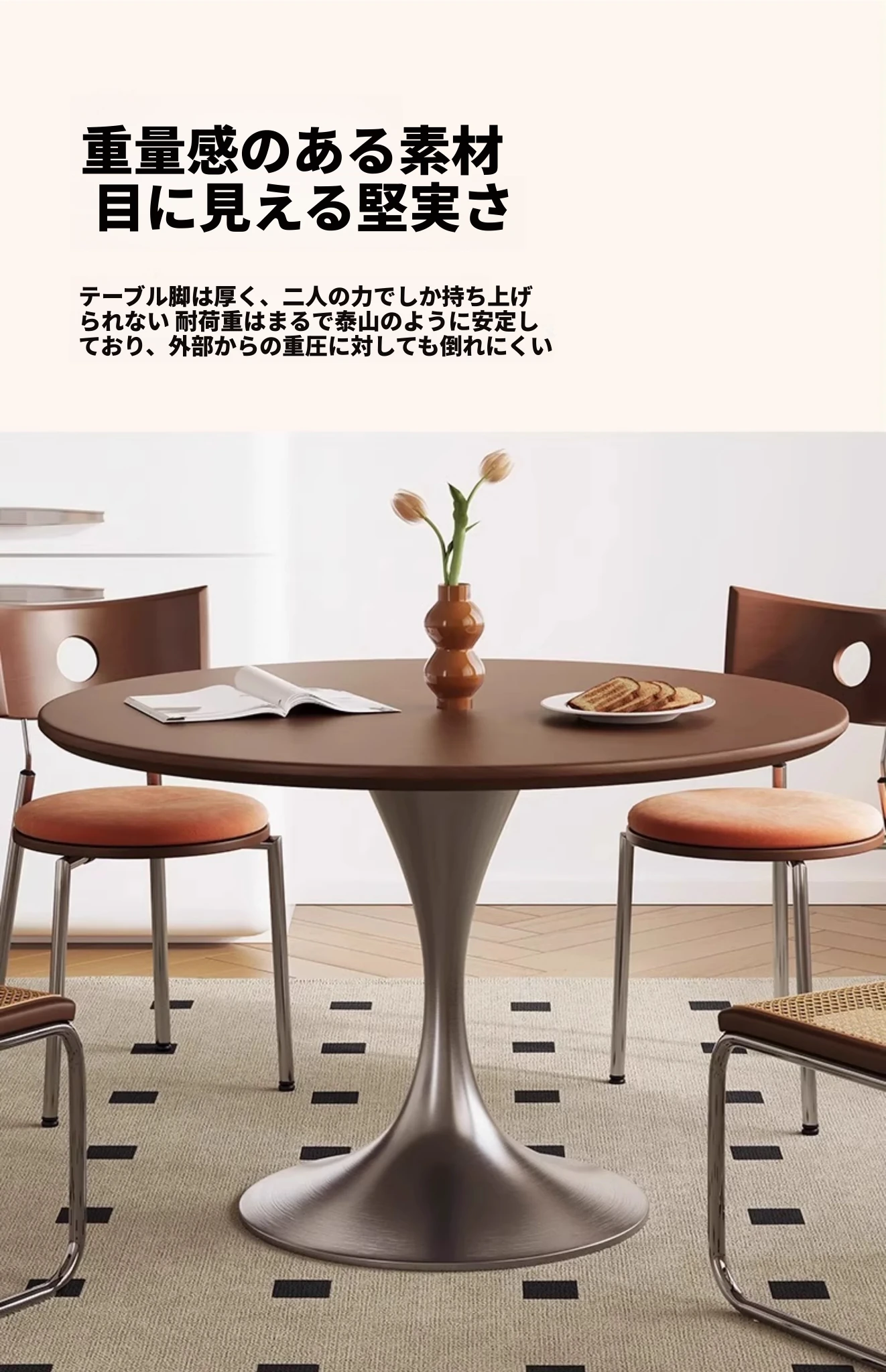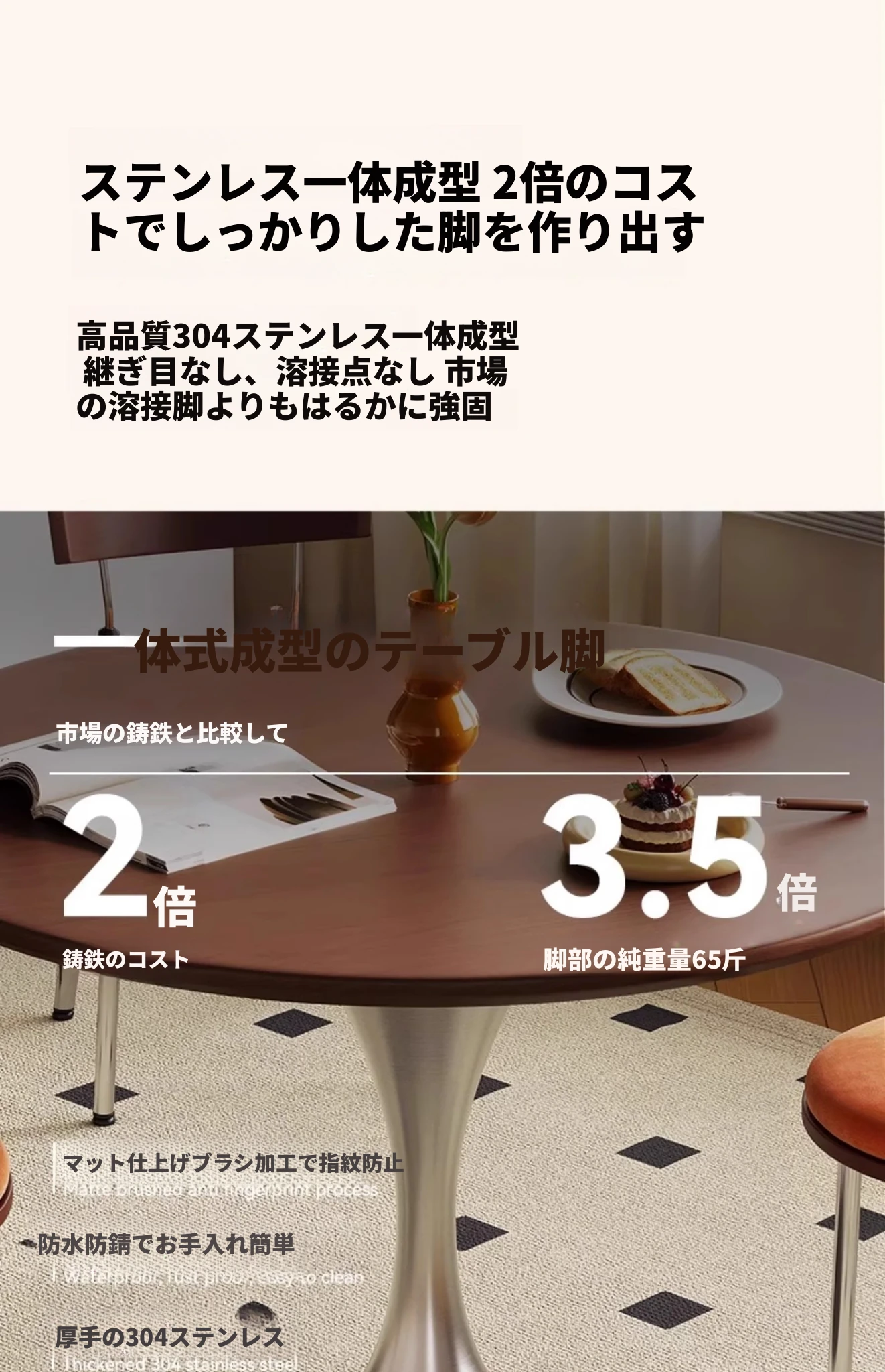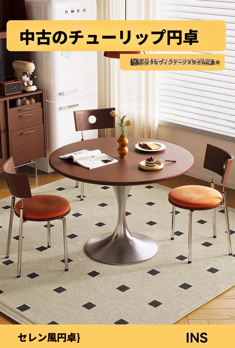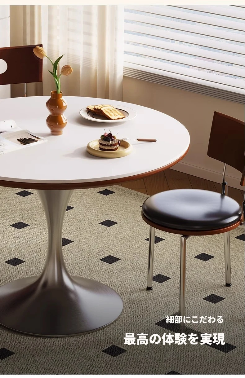 ヴィンテージ風の無垢材ダイニングテーブルとステンレス製の椅子のセット - 小型住宅に最適なチューリップデザインのレトロな円形テーブルと椅子で、居心地の良い食事空間を演出!